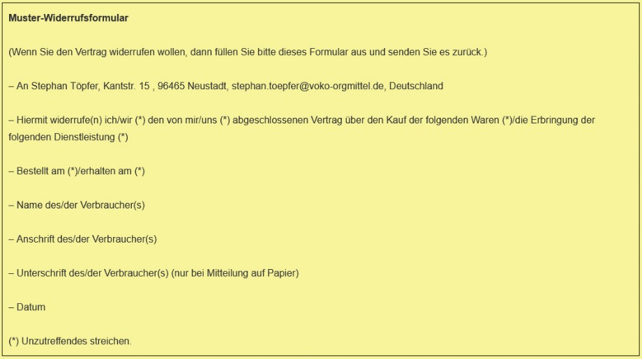 Um Ihr Widerrufsrecht auszuüben, müssen Sie uns (Stephan Töpfer, Kantstr. 15, 96465 Neustadt, stephan.toepfer@voko-orgmittel.de, Deutschland, Telefon: 09568 859944) mittels einer eindeutigen Erklärung (z. B. ein mit der Post versandter Brief, Telefax oder E-Mail) über Ihren Entschluss, diesen Vertrag zu widerrufen, informieren. Sie können dafür das beigefügte Muster-Widerrufsformular verwenden, das jedoch nicht vorgeschrieben ist.